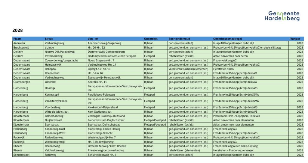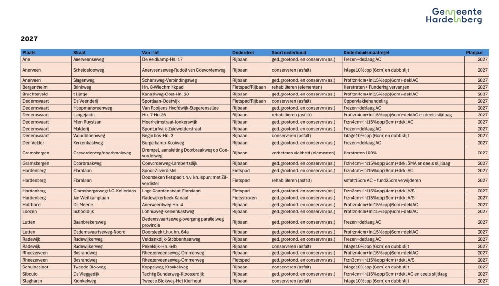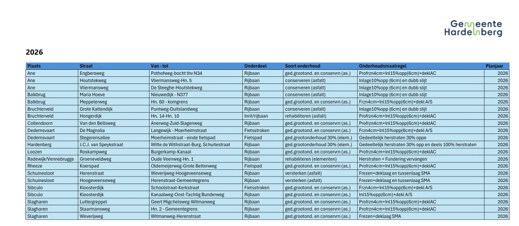 Hierbij het Meerjarig Onderhoud Programma van de wegen in de Gemeente Hardenberg en voor het gebied van Schuinesloot.